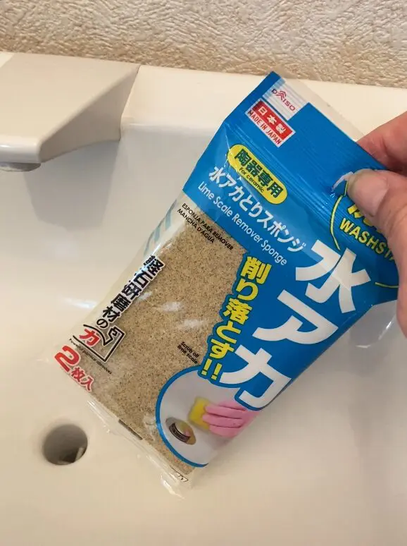 で、落ちないからと放置していたら本気で黒ずんできて、いよいよ気になりすぎてどうしようかと思っていたときに見つけたのが、DAISOのクエン酸と……水垢とりスポンジ!!