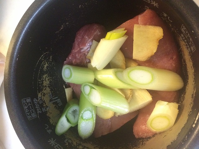 ②炊飯器に豚肉、切ったショウガとネギ、醤油と酒とみりんと水を入れて『炊飯』を押します。