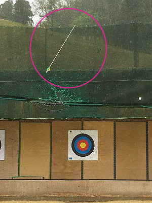 真上のネットに矢が突き刺さるという奇跡が生まれます。