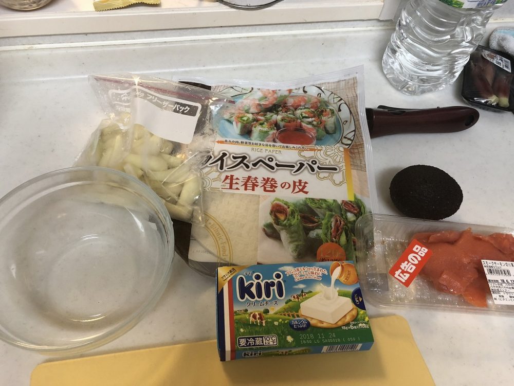 水にくぐらせたライスペーパーにサーモン、アボカド、クリームチーズ、水にさらしたらっきょうを置いて、包んで完成。