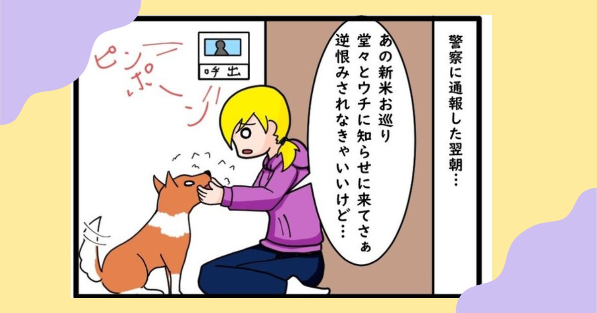 深夜に警察を呼んだ翌朝、隣人の母が突然我が家を訪問。「昨晩はごめんなさい」と謝りつつ語られた衝撃の一言とは…?小説『黒い家』を彷彿とさせる恐怖の対面を四コマ漫画…
